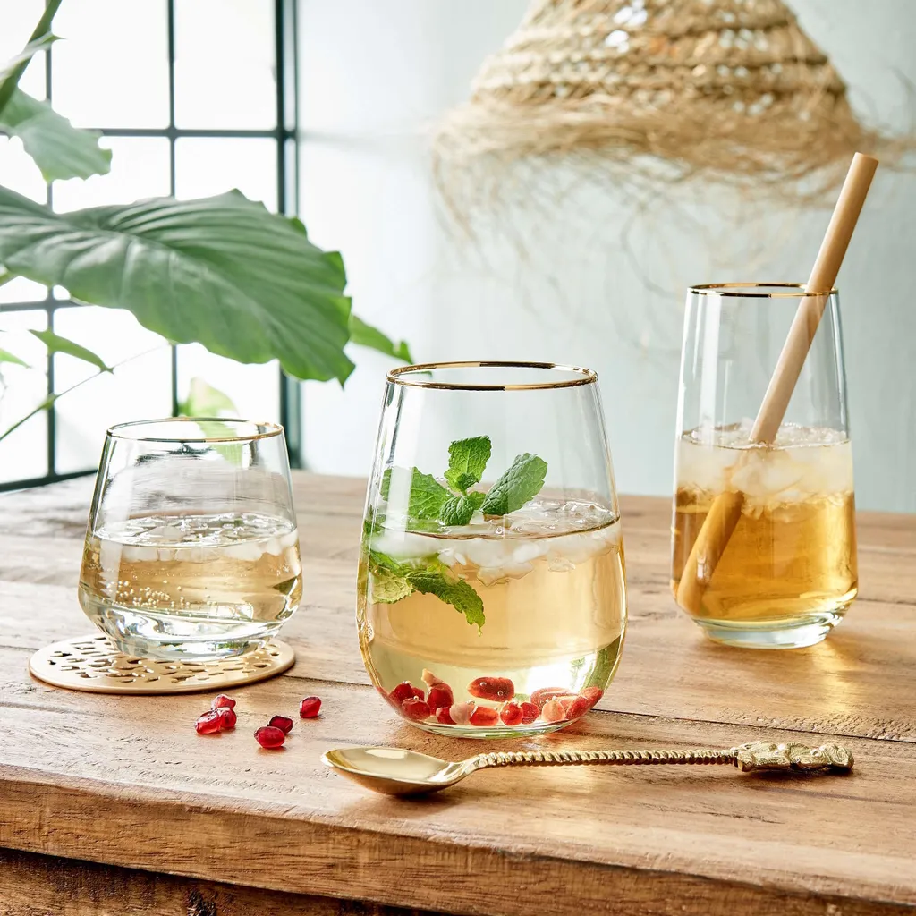 Da passt was rein: In unserem modernen Touch of Gold Longdrinkglas 480 ml im 6er-Set haben auch großzügig eingeschenkte Longdrinks Platz – inklusive einer ordentlichen Portion Eiswürfel. Da sitzen Sie und Ihre Gäste beim Essen und Feiern nicht so schnell auf dem Trockenen. Passendes Wasserglas erhältlich.