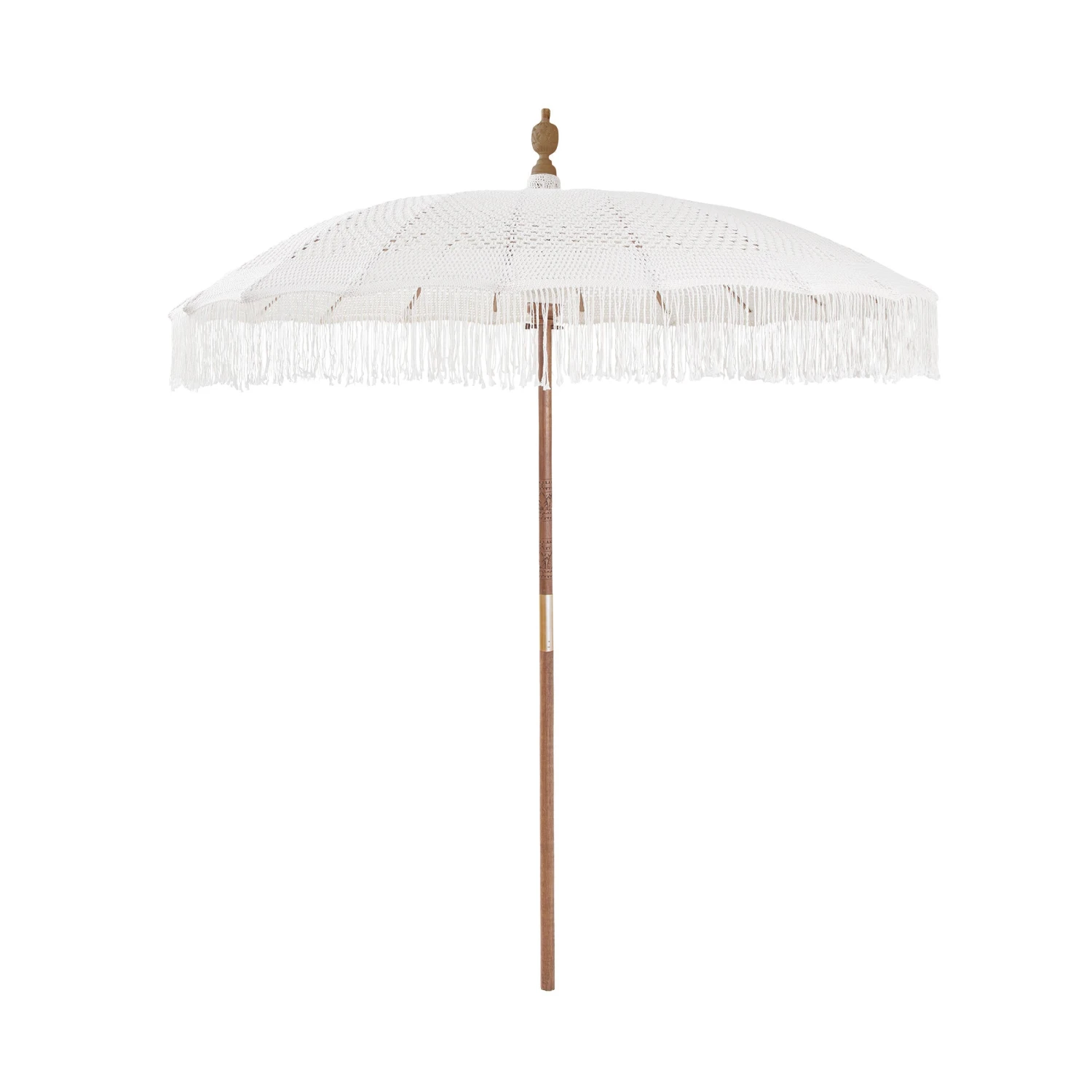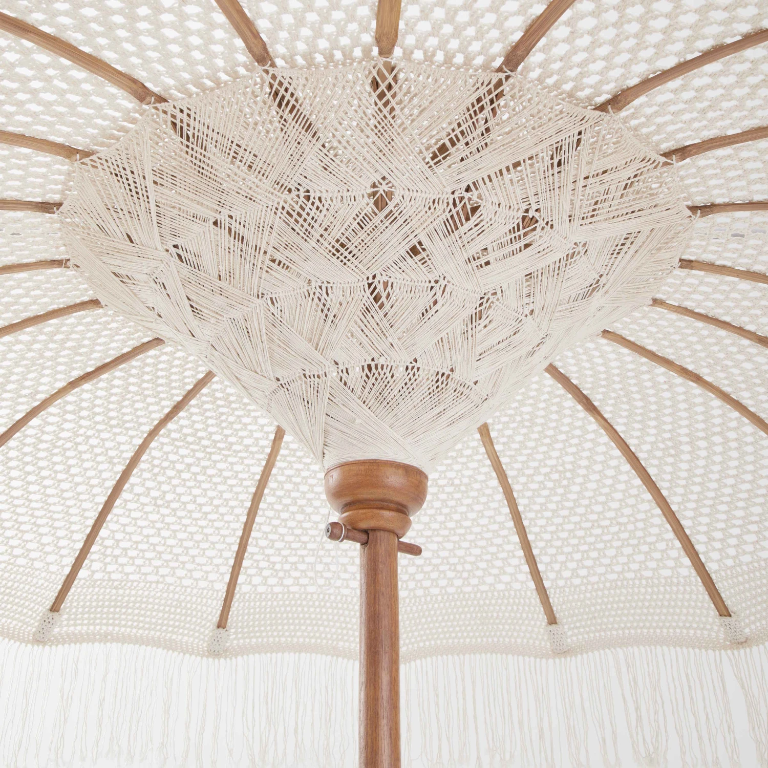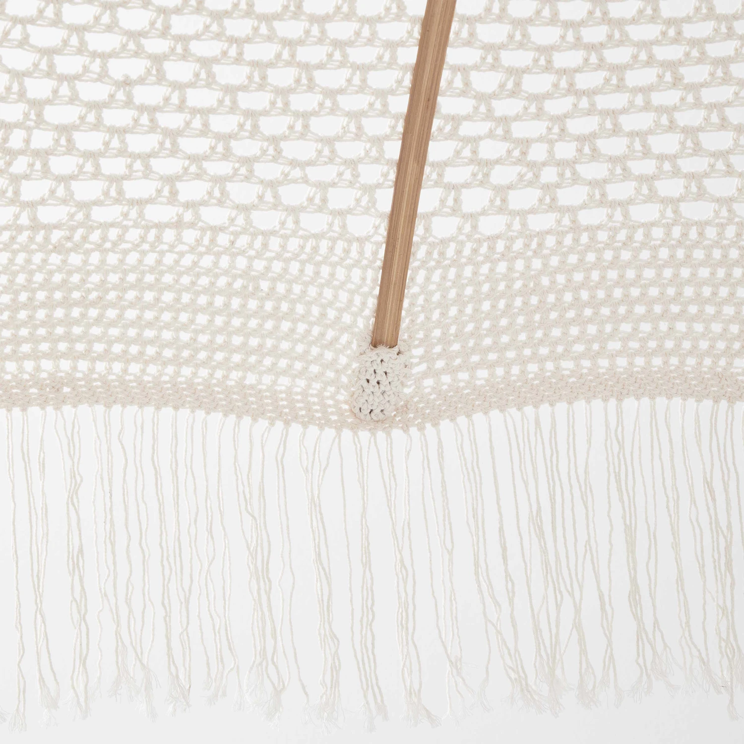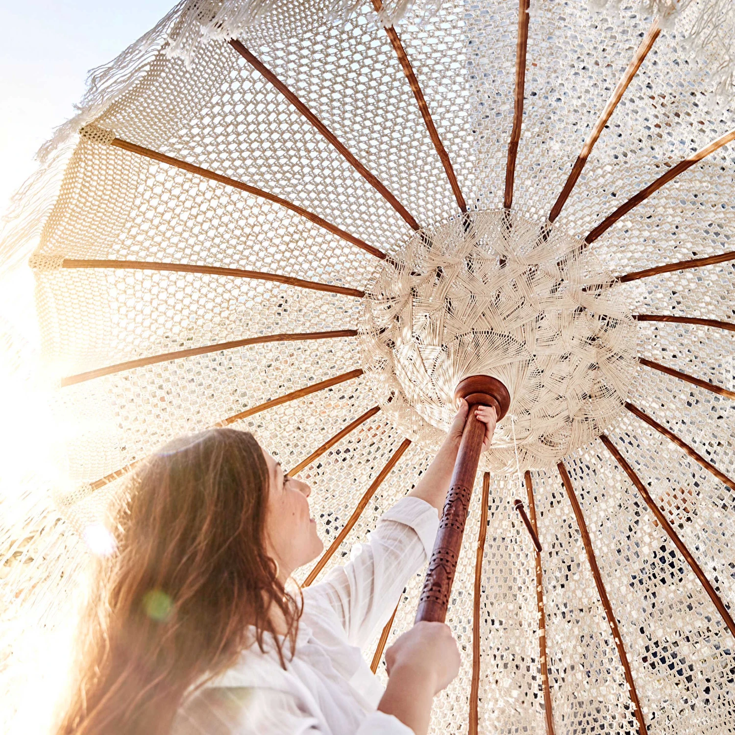 Aufspannen – und entspannen! Mit dem wunderschönen Macramé Sonnenschirm ist die Leichtigkeit des Urlaubs im Handumdrehen auf dem eigenen Balkon oder der heimischen Terrasse herbeigezaubert. Gefertigt ist der hochwertige Schirm aus naturfarbener Baumwolle in traditioneller balinesischer Handarbeit, mit aufwändigen Details, kunstvollen Mustern und verspielten Fransen. Stock, Gestell und Spitze des Schirm setzen mit echtem Mangoholz ebenfalls auf ein authentisches Naturmaterial. Also, machen Sie es sich mit einem kühlen Mango-Lassi bequem und genießen Sie einen wunderbaren ganz-weit-weg-Moment im eigenen Zuhause.
