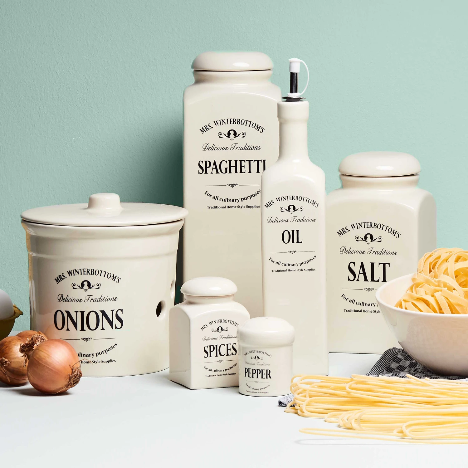 Weil die Essigflasche alleine so verloren aussieht, kommt hier die passende Ölflasche dazu. Abnehmbarer Ausgießer. Bei der Serie Mrs. Winterbottom’s ist an alles und jeden gedacht. Dies und das lässt sich mit den traditionellen Dosen, Flaschen, Töpfen, Schalen, Kannen etc. aufbewahren und/oder auftischen. Jedes Teil ist aus Dolomit exklusiv für Butlers gefertigt und trägt ein typisch englisches Dekor. Und natürlich passt alles so perfekt zusammen wie die Deckel auf die Töpfe oder die Metallausgießer auf die Flaschen.