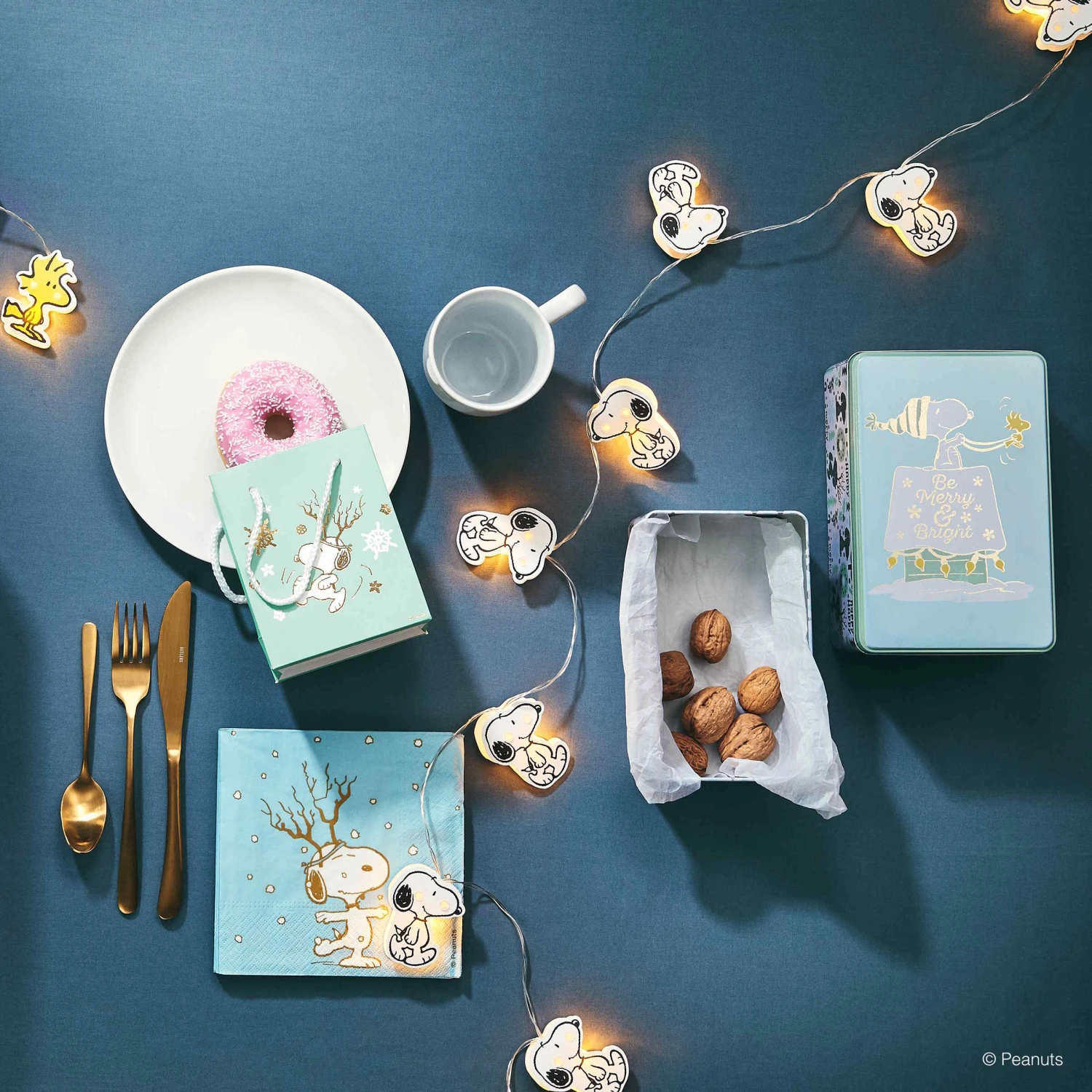 Make my Day: Bei der Peanuts LED Papierlichterkette mit 20 LED und USB-Batteriefach erhellt Ihnen Snoopy den Tag. Kein Tag ohne Peanuts und die Widersprüche des Lebens: Fast 50 Jahre lang begeisterte Charles M. Schulz seine Leser jeden Tag mit neuen Geschichten von Pechvogel Charlie Brown, seinem eigensinnigen Hund Snoopy und den anderen kleinen Charakterköpfen aus der Nachbarschaft. Jetzt tritt die ganze Bande wieder in Aktion – bei der exklusiven Peanuts-Serie von Butlers. Auf Geschirr, Tischwäsche, Küchenutensilien, Wohnaccessoires, Geschenktaschen, Notizbüchern und natürlich als Plüschtier lassen Sie Ihre Lieblingsfiguren bei sich zu Hause einziehen. Auch wenn Charlie Brown sich ständig beschwert „Keiner mag mich“ und Lucy van Pelt entsetzt feststellt „Der Hund hat mich geküsst!“