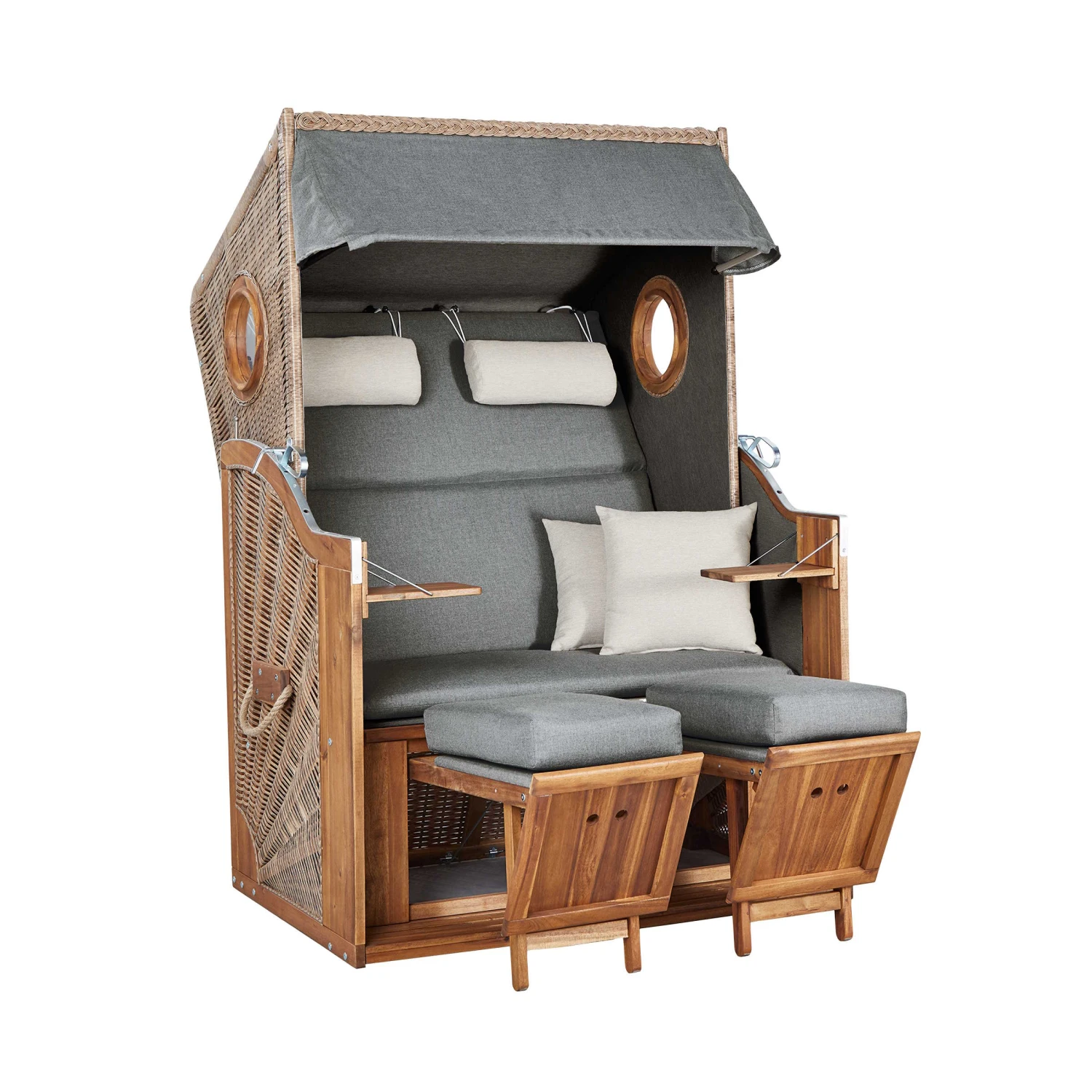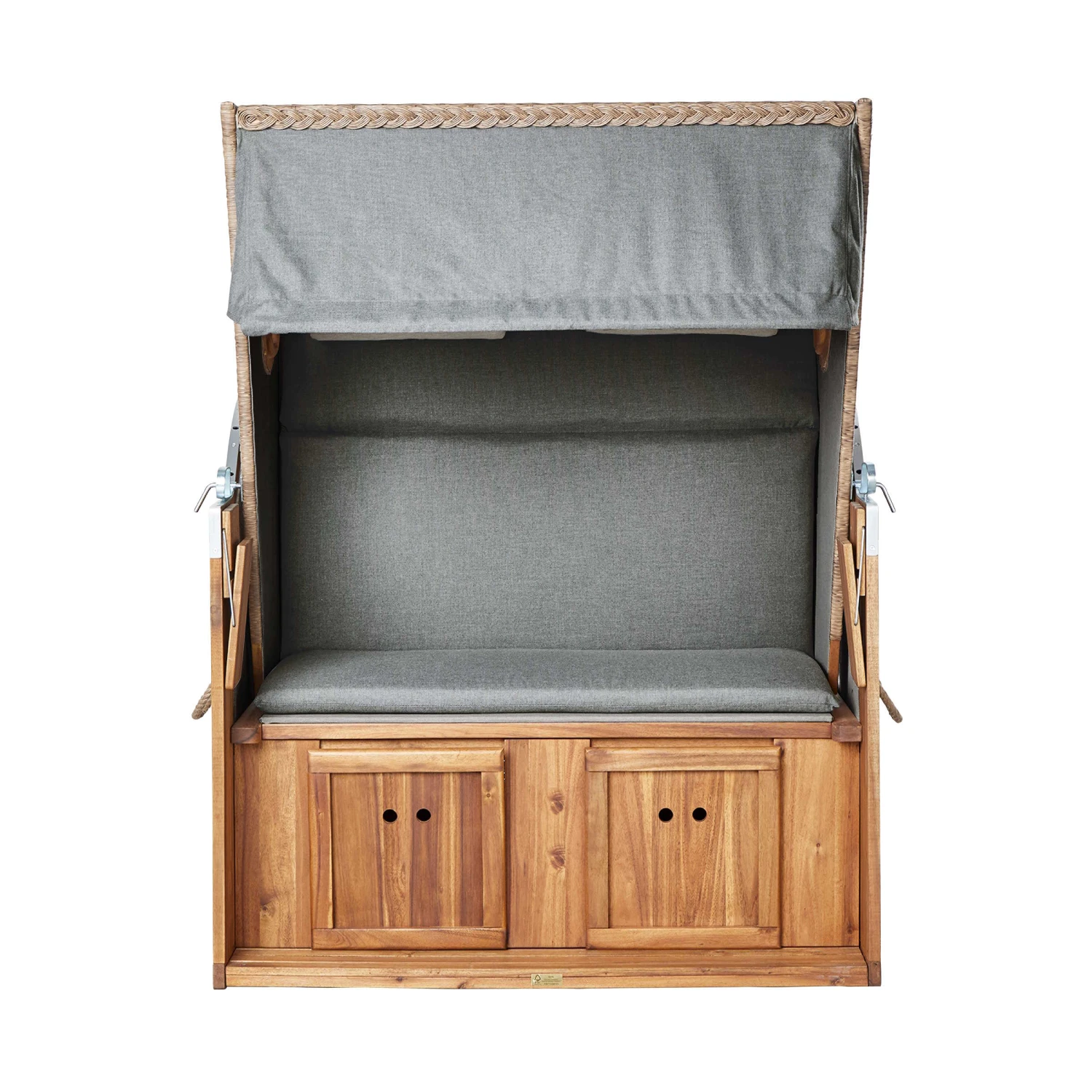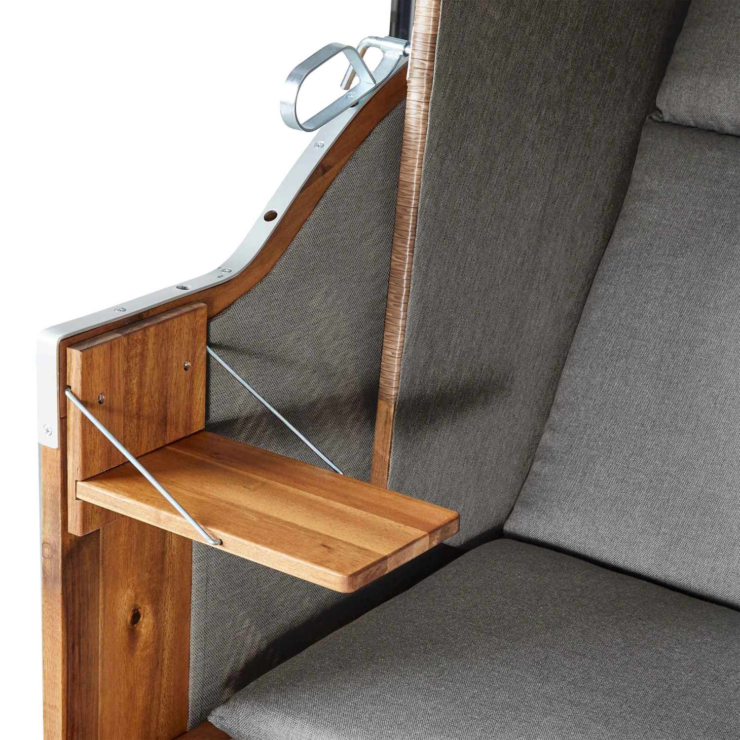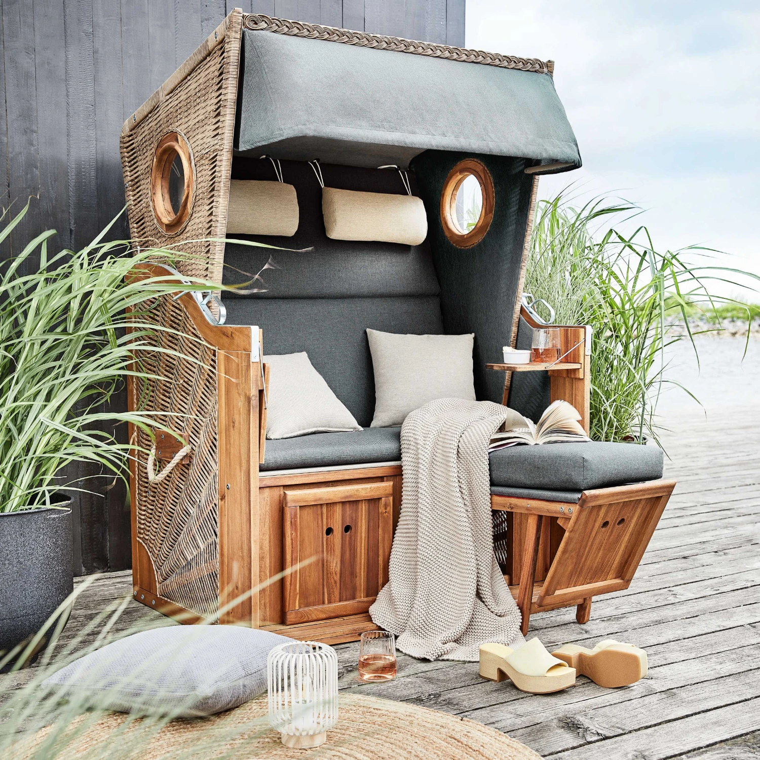 Sie träumen sich ans Meer in Ihrem hochwertigen Sylt Strandkorb und genießen Urlaubsmomente im eigenen Zuhause. Der moderne, maritime Strandkorb in neutralem Grau-Braun, gefertigt aus FSC®–zertifiziertem Akazienholz und hochwertigem, witterungsbeständigem PE-Geflecht, ist mit vier Verstellmöglichkeiten und einem großen Neigungswinkel besonders anpassungsfähig. Das Verstellen selbst gelingt ganz leicht, so dass Sie jederzeit vom Sitzen zum Zurücklehnen wechseln können. Für Komfort beim Entspannen sorgen Kissen, Klapptischchen und verstaubare Fußstützen, und zum Lesen fällt Licht durch die Bullaugen ein. So machen Sie es sich wunderbar gemütlich, gut geschützt auch bei Wind und kühleren Temperaturen. Passsende Sylt Schutzhaube und Doppellenkrollen separat erhältlich.
