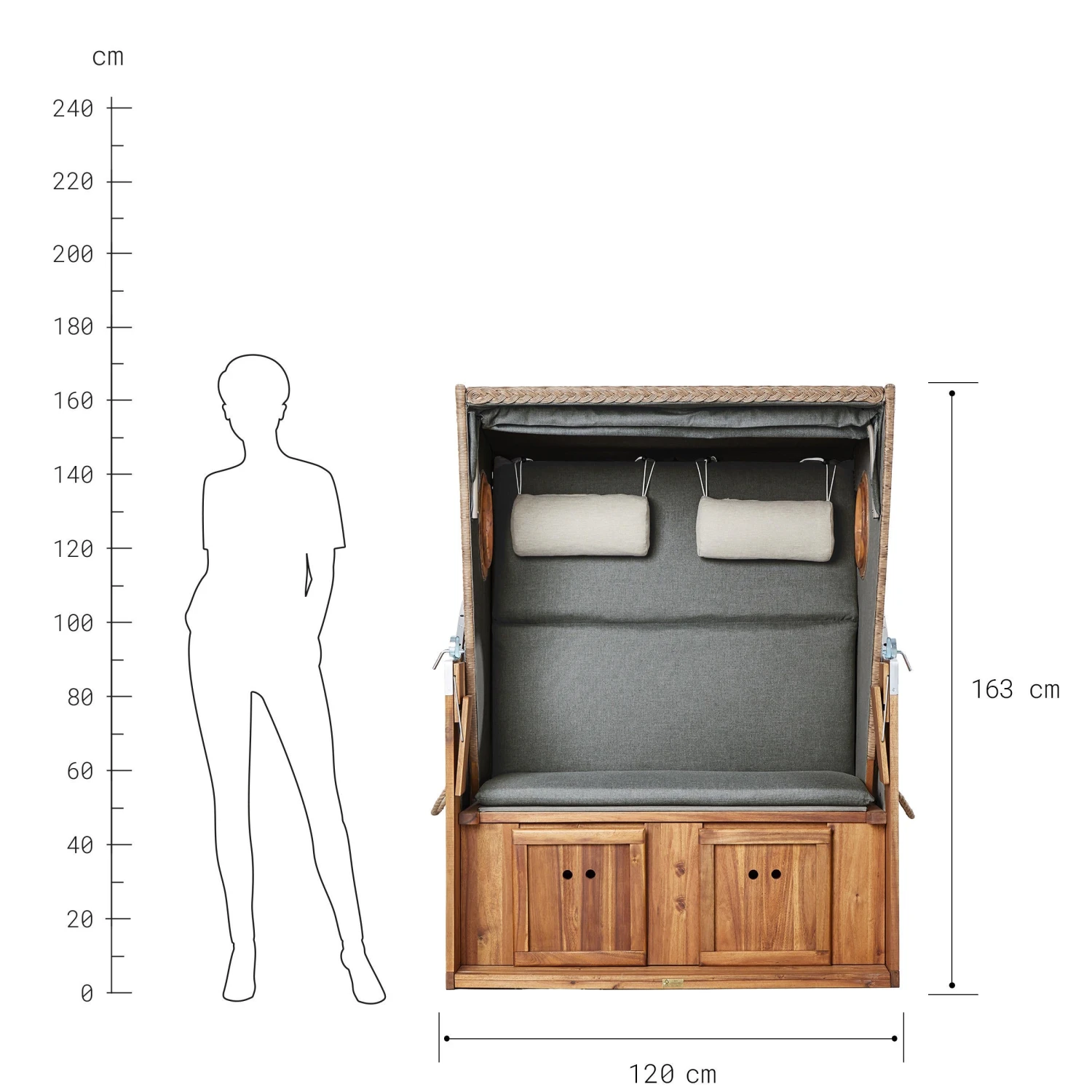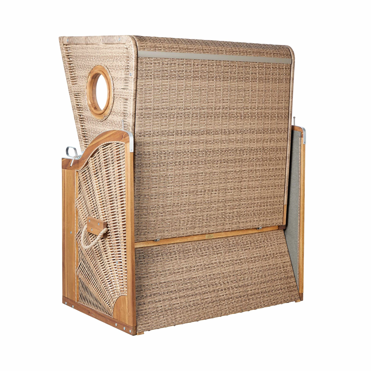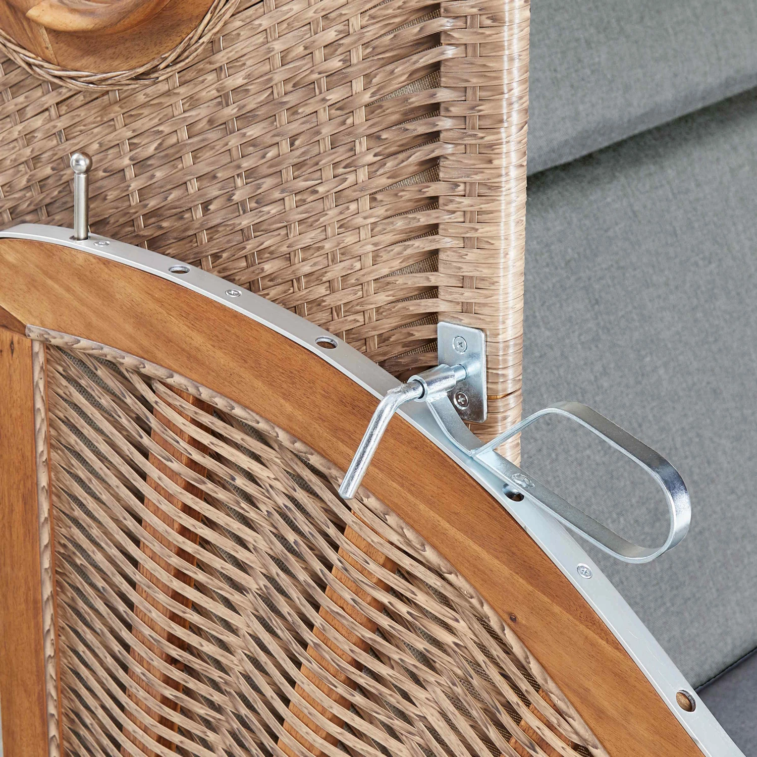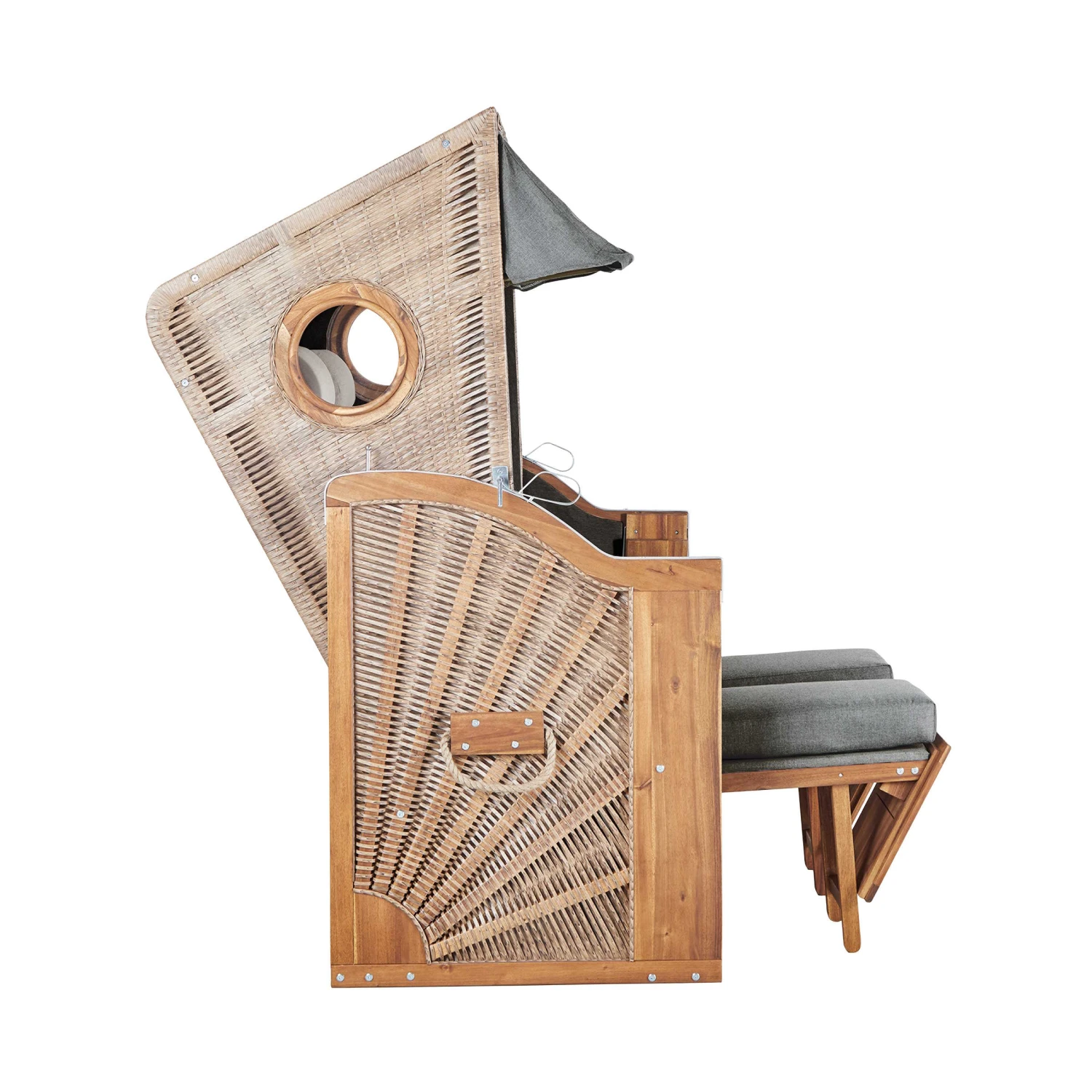 Sie träumen sich ans Meer in Ihrem hochwertigen Sylt Strandkorb und genießen Urlaubsmomente im eigenen Zuhause. Der moderne, maritime Strandkorb in neutralem Grau-Braun, gefertigt aus FSC®–zertifiziertem Akazienholz und hochwertigem, witterungsbeständigem PE-Geflecht, ist mit vier Verstellmöglichkeiten und einem großen Neigungswinkel besonders anpassungsfähig. Das Verstellen selbst gelingt ganz leicht, so dass Sie jederzeit vom Sitzen zum Zurücklehnen wechseln können. Für Komfort beim Entspannen sorgen Kissen, Klapptischchen und verstaubare Fußstützen, und zum Lesen fällt Licht durch die Bullaugen ein. So machen Sie es sich wunderbar gemütlich, gut geschützt auch bei Wind und kühleren Temperaturen. Passsende Sylt Schutzhaube und Doppellenkrollen separat erhältlich.