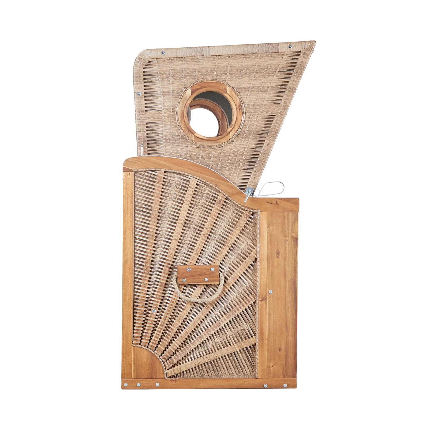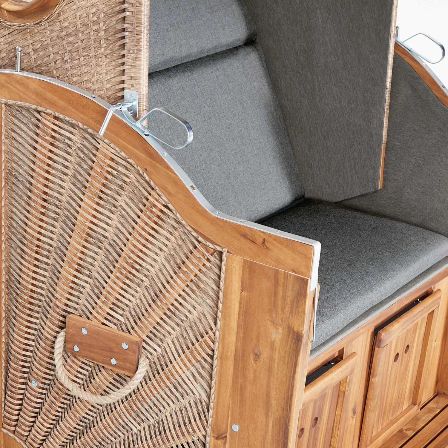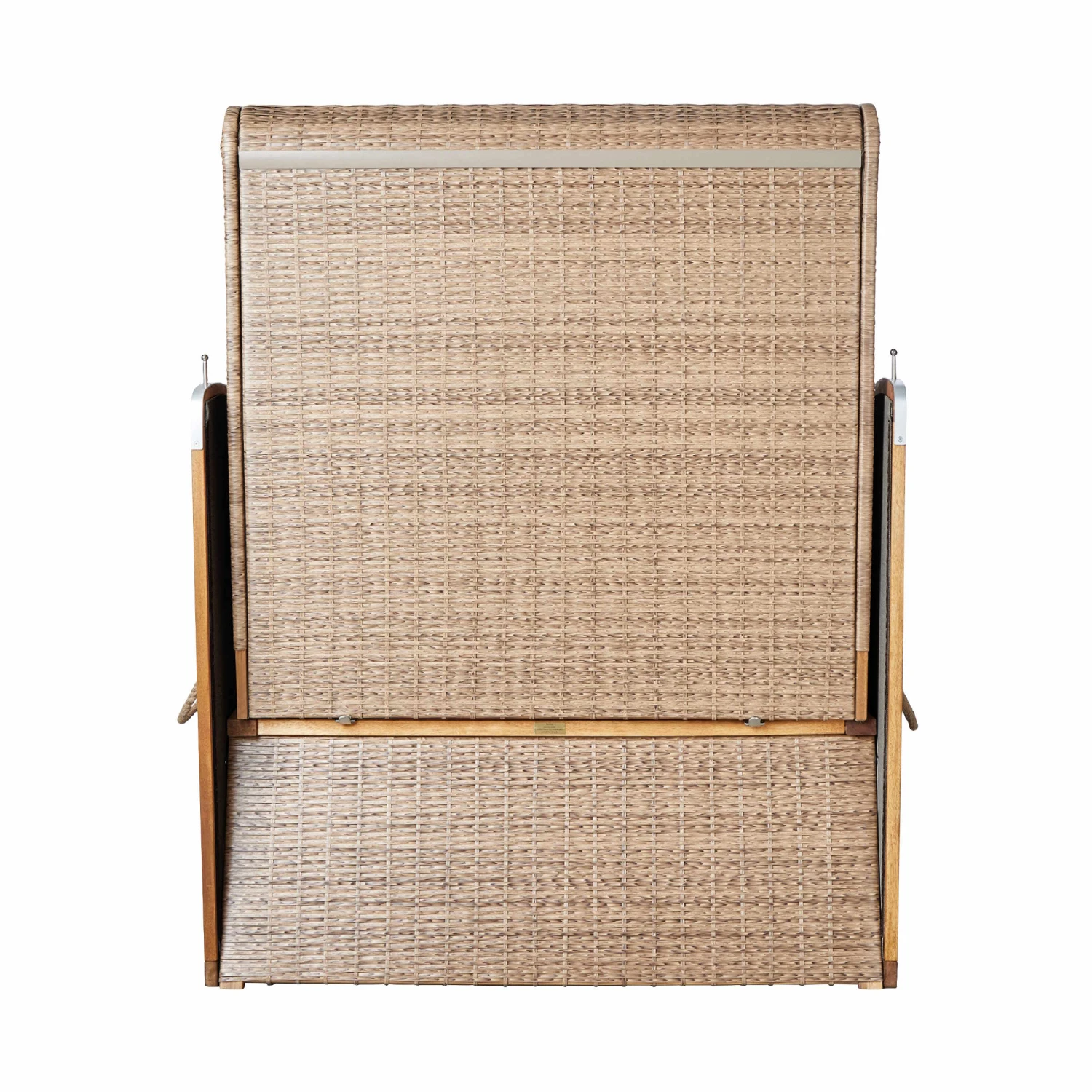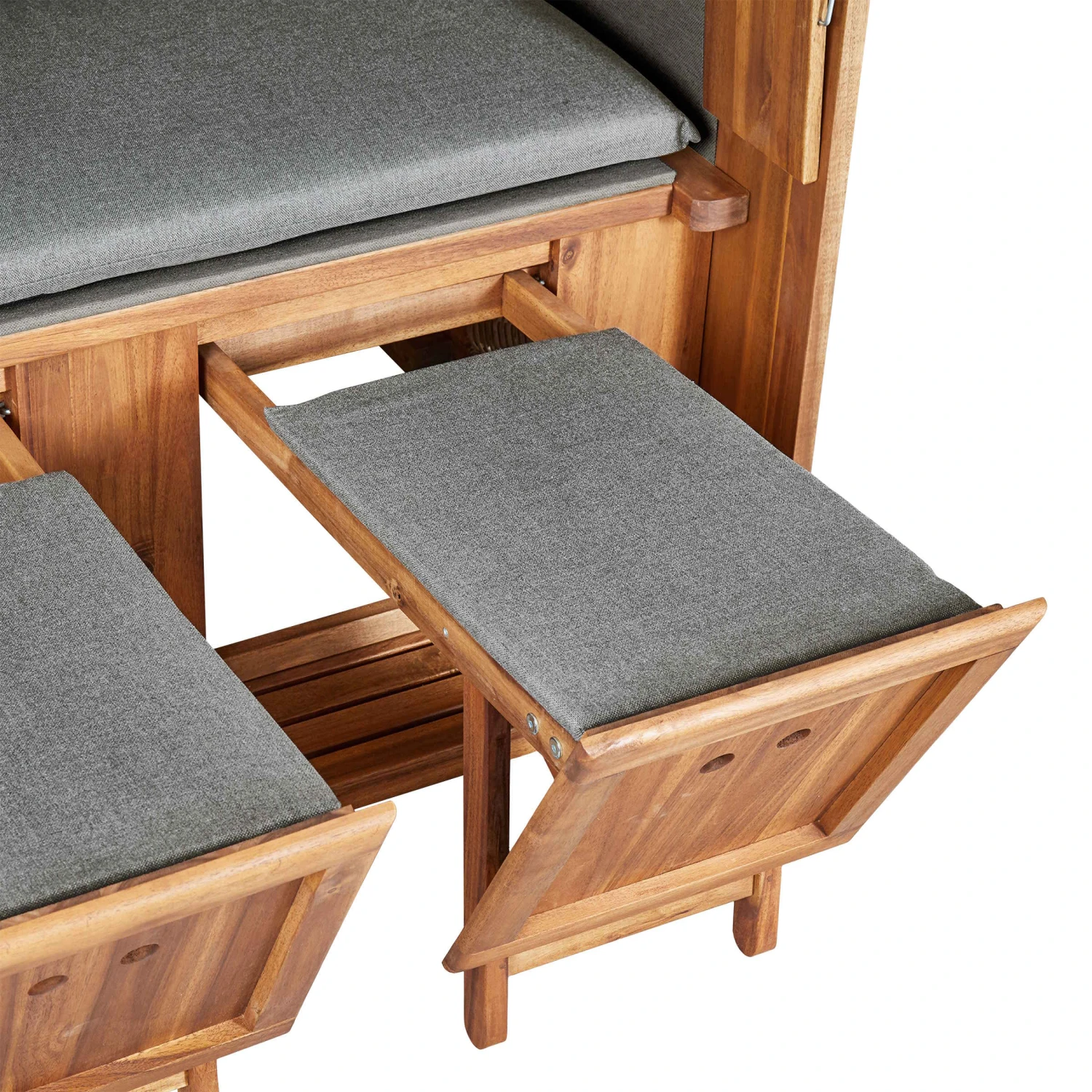 Sie träumen sich ans Meer in Ihrem hochwertigen Sylt Strandkorb und genießen Urlaubsmomente im eigenen Zuhause. Der moderne, maritime Strandkorb in neutralem Grau-Braun, gefertigt aus FSC®–zertifiziertem Akazienholz und hochwertigem, witterungsbeständigem PE-Geflecht, ist mit vier Verstellmöglichkeiten und einem großen Neigungswinkel besonders anpassungsfähig. Das Verstellen selbst gelingt ganz leicht, so dass Sie jederzeit vom Sitzen zum Zurücklehnen wechseln können. Für Komfort beim Entspannen sorgen Kissen, Klapptischchen und verstaubare Fußstützen, und zum Lesen fällt Licht durch die Bullaugen ein. So machen Sie es sich wunderbar gemütlich, gut geschützt auch bei Wind und kühleren Temperaturen. Passsende Sylt Schutzhaube und Doppellenkrollen separat erhältlich.