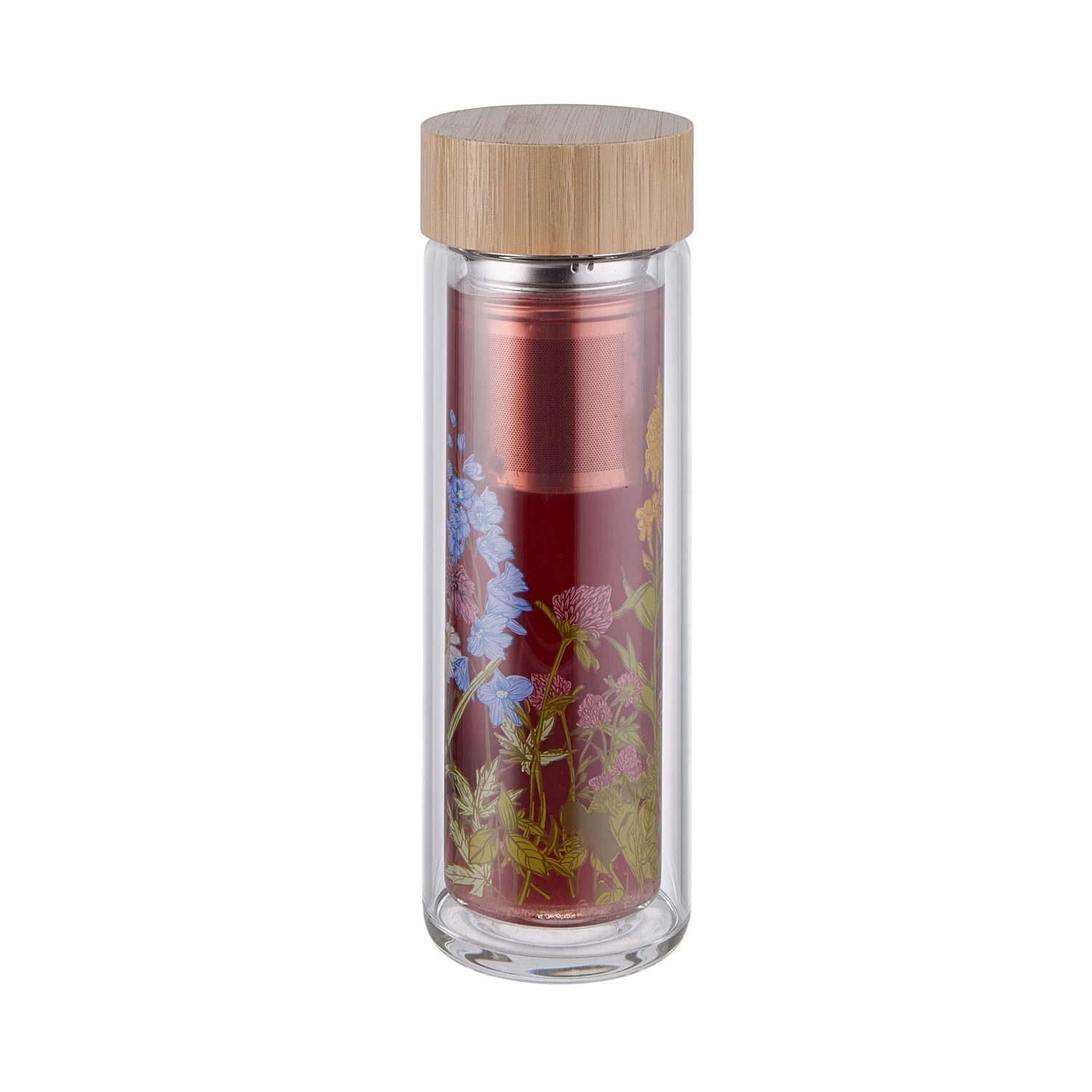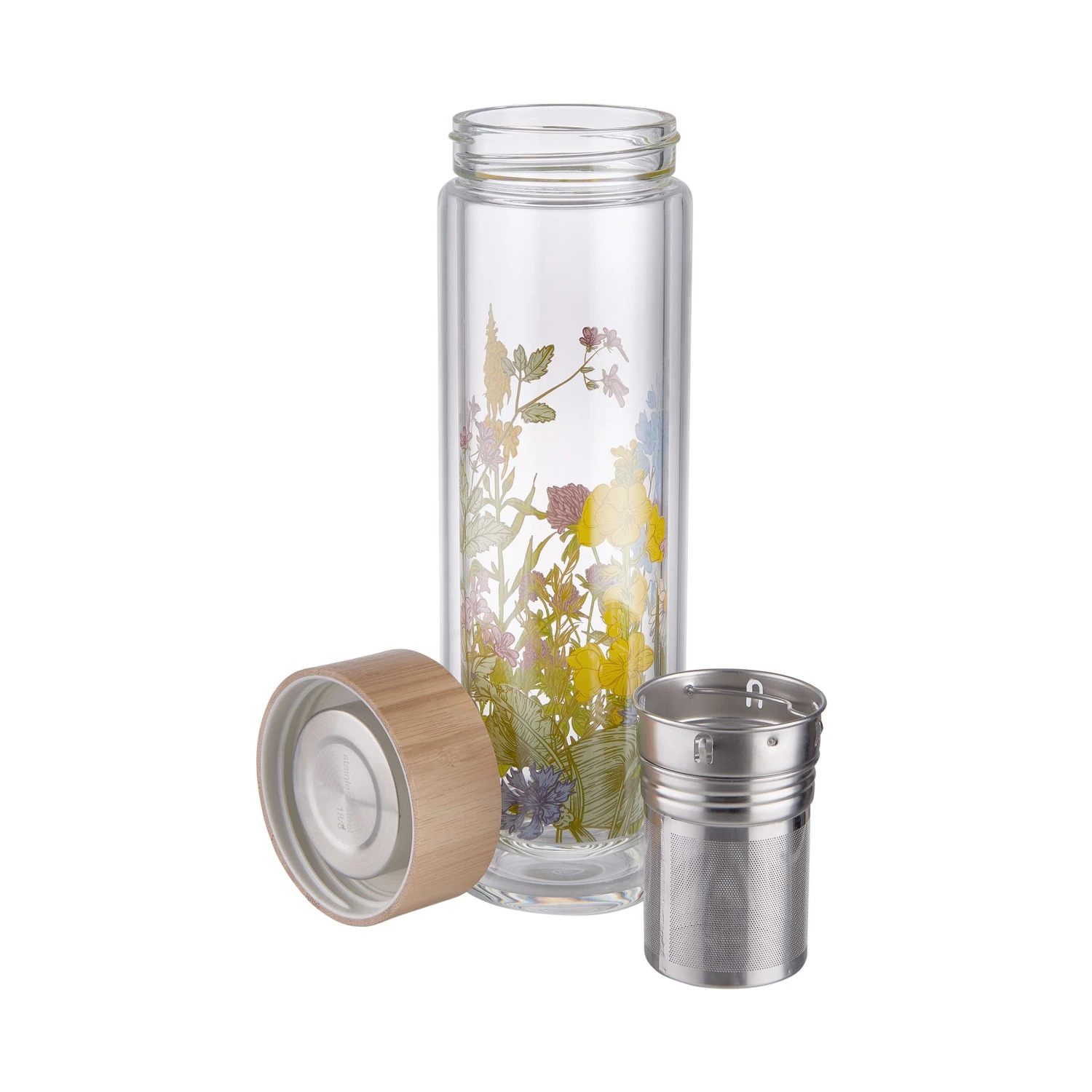 Tea to go in seiner schönsten Form: Die designige Tea Tender Teeflasche mit Blumendruck aus robusten Borosilikatglas bringt mit Edelstahlsieb und Holzverschluss alles mit, was Sie für die Zubereitung und den Transport Ihres Lieblings-Tees oder Infused Waters brauchen.