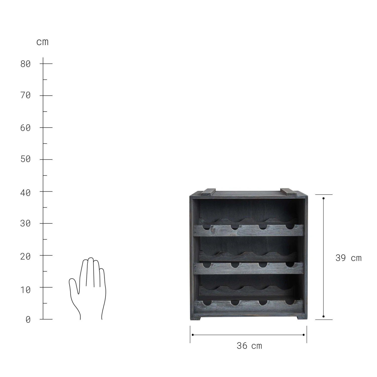Länge 36 x Breite 32 x Höhe 39 cm, Abstand zwischen den Regalböden: 8,5 cm, Ø für die Flaschen: 27 cm
